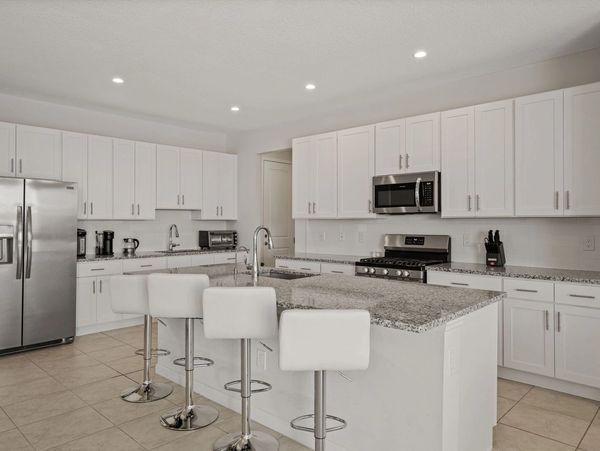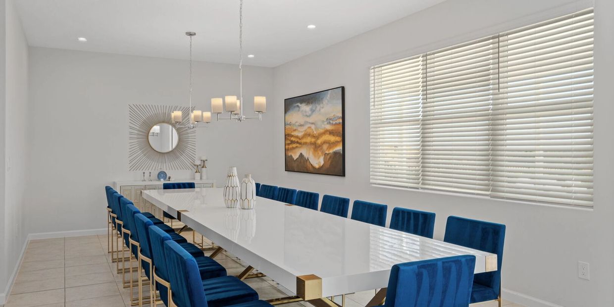 The dining table can comfortably accommodate up to 18 guests, and there's even more seating available at the kitchen island bar. The kitchen itself is fully equipped with top-of-the-line Kosher stainless